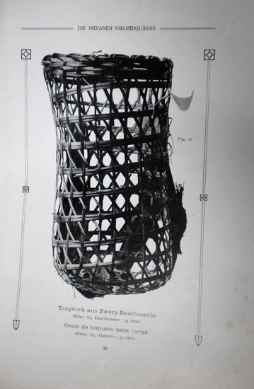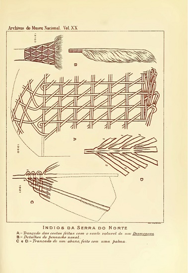 Como mencionado, a profundidade das análises dos objetos tem reflexo na catalogação estendida. Em Rondônia, Roquette-Pinto sai do registro do objeto e deixa a informação sobre a técnica para outro etnólogo. O autor vê na sistematização dos trançados dos índios brasileiros de Max Schmidt140 que o trançado simples e característico do Atiçú, nome étnico do mesmo cesto-cargueiro Nhambiquara, e do mesmo abano é também comum a diversas etnias da região do Xingu. Assim, Schmidt amplia a zona de contato dos índios do Guaporé (Figura 19).