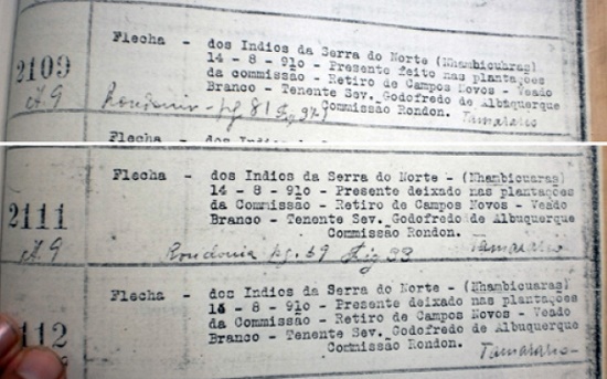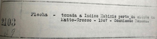 No texto no número de ordem 2103 (Figura 8): “Flecha - tomada a Índios Cabixis perto da cidade de Mato-Grosso - 1907 - Comissão Rondon”,106 temos: o objeto, a ação, quem a sofre, onde ela se desenrola e a data. Por ser também descrita em “Notas…” confirma-se que se trata de flecha da etnia Nhambiquara.107 A descrição científica foi usada como ferramenta neste discurso de civilização dos índios, de ação entre grupos. Cabixi era a designação dada pelos habitantes de Vila Bela da Santíssima Trindade (hoje cidade do Mato Grosso) ao subgrupo Nhambiquara Uáikoákoré. O termo é da língua Pareci e tem sentido pejorativo, pois é usado para referir-se aos índios tidos como menos civilizados. Os Pareci, dos subgrupos Caxiniti e Uaimaré, davam o mesmo nome ao subgrupo Cozarini. A região da cidade do Mato Grosso era uma área de contato entre Pareci Cozarini e Nhambiquara Uáikoákoré.108 Rondon foi o primeiro a diferenciar Pareci de Nhambiquara e iniciar uma relação pacífica entre todos os grupos.