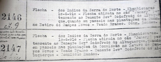 As trocas de presentes e a “caça de animais” da fazenda apresentadas anteriormente em “Notas…” também são explicitadas em sequências narrativas no Tombo. Na documentação museológica, mesmo que as entradas dos números de ordem não sigam a cronologia dos eventos, o discurso da civilização dos índios não sofre qualquer distúrbio. Não há um corte na narrativa, como é possível observar nas sequências de flechas, todas com a mesma descrição, entre os números de ordem 2109 e 2112 (Figura 4):
