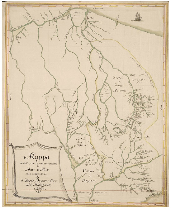 A extração de ouro nas Minas de Goiás e nas Minas do Tocantins foi iniciada na década de 1720, no território que viria a se tornar Capitania de Goiás em 1748. A partir do momento em que se iniciou a exploração aurífera, diferentes povos se dirigiram aos promissores arraiais, sobretudo “paulistas”, “baianos”, portugueses e africanos - a grande força motriz que movimentou a capitania. Vale lembrar que esse extenso território havia sido trilhado antes por sertanistas, religiosos e sesmeiros - sem mencionar as diversas etnias indígenas que lá habitavam, como os caiapó ao sul, os carajá e avá-canoeiro nas proximidades do rio Araguaia, os xavante entre os rios Araguaia e Tocantins, e os xerente a nordeste, dentre outras. A cartografia do Setecentos sinaliza a malha hidroviária, a rede de estradas e arraiais, e os grandes “vazios” no território, os sertões onde viviam as diversas nações indígenas (Figura 1).