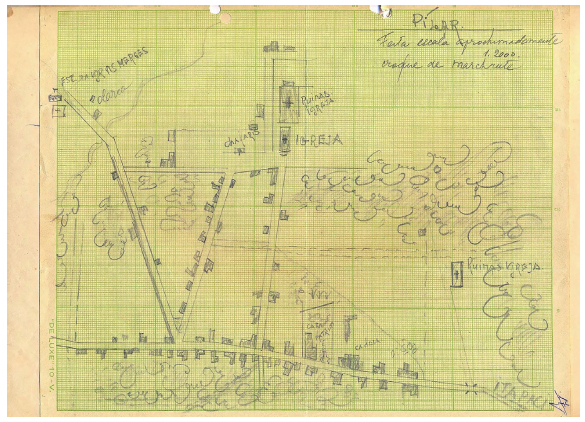 Como não foram produzidas plantas do arraial de Pilar durante o período colonial, debruçamo-nos na planta da cidade de 1964 da tese “Notas sobre a arquitetura do século XVIII em Pilar de Goiás”95 (Figura 9) e nos levantamentos urbanos elaborados no âmbito do tombamento federal de Pilar, na década de 195096 (Figura 10).