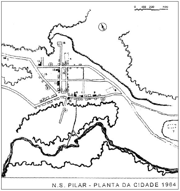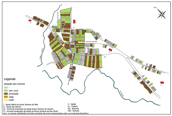 Tendo como base uma planta digital atual da cidade, espacializamos os dados da Décima Urbana de 1816 trabalhando em plataforma georreferenciada. Dado que a cidade passou por vários processos de descaracterização urbanística e arquitetônica, e não foram produzidas plantas de Pilar nos séculos XVIII e XIX, ressaltamos que os mapas produzidos são hipotéticos e não refletem, necessariamente, o arraial do início do século XIX. Além da pesquisa documental e bibliográfica, a visita a campo fez parte do processo de identificação dos bens, assim como a consultoria dos arqueólogos que trabalharam no município de Pilar.97