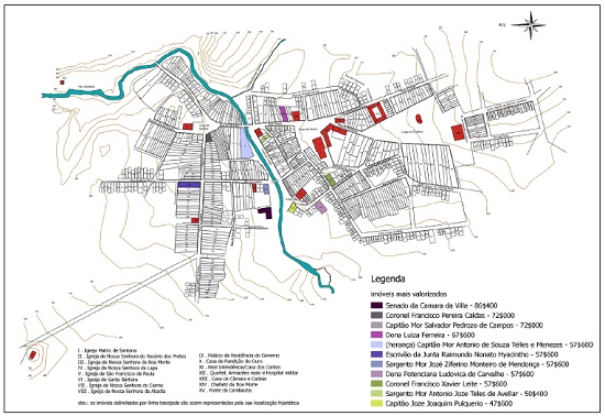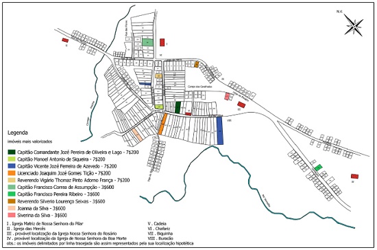 Cotejando os dados com os valores registrados na Décima Urbana de 1814, identificamos que os imóveis mais valorizados também se encontravam em outros logradouros centrais, como no Largo da Matriz, Largo do Rozario, Rua dos Paulistas e Vira Copos, com valores muito superiores a 7$200 réis. Ou seja, em poucos anos, os imóveis tiveram uma desvalorização bastante acentuada, o que reforça o caráter de crise em que vivia Pilar no início do Oitocentos.