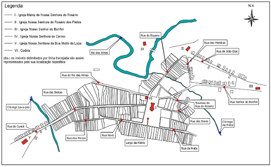A toponímia apresenta pistas de equipamentos extintos, como a antiga Contagem e a extinta Igreja do Terço. A Rua da Contage, localizada na saída sul de Natividade, revela a existência de um posto fiscal na estrada que conduzia aos arraiais de Conceição e Arraias. Na Rua da Matriz foi cadastrado o imóvel nº 156, pertencente à Secretaria do Terço, provavelmente irmandade do templo de mesmo nome. De acordo com Rodrigues,207 a igreja estava localizada na Rua da Praça e estimamos que estivesse na esquina com a então Rua do Terço, cadastrada na Décima Urbana de 1817 como Rua da Matriz. A toponímia confirma a localização de outros logradouros, principalmente nos casos da Rua de São Benedito, Rua da Matriz e Largo da Matriz. A Rua do Cruzeiro manteve seu nome ao longo dos anos e a toponímia se aplica muito bem nesse caso, uma vez que no trecho central da rua do lado ocidental existiam alguns cruzeiros. A identificação dos largos foi facilitada mais uma vez tendo como referência a toponímia, como exemplo o Largo da Matriz e o Largo da Praça. Mesmo assim, a espacialização dos dados não foi fácil, situação que se repetiu em todos os núcleos, pelos motivos apontados anteriormente.