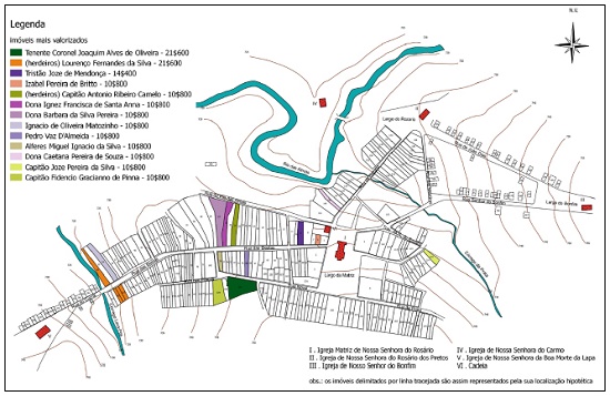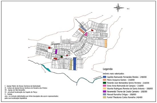 Do rol dos 22 proprietários que tinham mais de uma casa no arraial em 1817, seis estavam entre os detentores dos imóveis mais valorizados do arraial: Maria Joaquina Gomes, Dona Anna Raimunda de Campos, Manoel Ramalho Ortigas, Capitão Raimundo Fernandes Pereira, Furriel Theotonio Carlos Ramalho e Reverendo Thome de Crasto Carneiro (Figura 23).