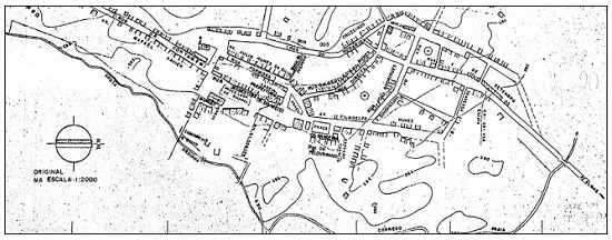 Assim como ocorre nas outras localidades, os nomes dos logradouros foram alterados com o passar dos anos. Em Natividade, o processo de relacionar os nomes antigos e atuais foi facilitado, pois os logradouros da cidade possuem placas com os nomes atuais das vias e sua nomenclatura anterior. O trabalho foi complementado com o cruzamento de dados dos mapas encontrados no Processo de Tombamento de Natividade,202 dos quadros relacionando a denominação antiga e atual dos logradouros presentes na Lei Municipal nº 12/90 e de conversas com pessoas da cidade. A análise cartográfica, todavia, foi dificultada em função da ausência de mapas de época. A cartografia mais antiga encontrada na cidade foram mapas da década de 1970, além dos mapas do Processo de Tombamento (Figura 20). Como base para espacializar a Décima Urbana de Natividade de 1817, utilizamos a planta digital da cidade disponibilizada pelo Iphan.
