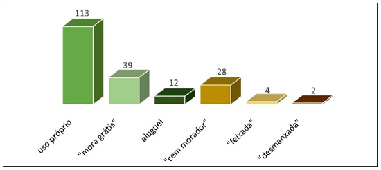 Considerando os imóveis desabitados e arruinados, o número assustava: de 308 imóveis, 177 casas estavam nesse estado. Isso equivale dizer que 58% dos imóveis de Meia Ponte em 1819 estavam desocupados (Figura 17).