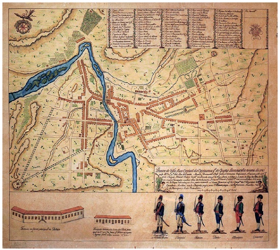 Em relação aos dados da Décima Urbana, analisamos três mapas de Vila Boa-Goyaz: Planta da antiga Villa Boa dos Goyazes (c. 1772),46Planta de Villa Boa Capital da Capitania Geral de Goyas (1782)47 (Figura 3), Planta da Cidade de Goyaz (1892).48 A documentação iconográfica também auxiliou bastante nesse processo, principalmente o conjunto de três vistas de Vila Boa de 1751,49 os desenhos de William Burchell de 1828, a Prespectiva de Villa Boa de Goyas de 180350 e fotos antigas.