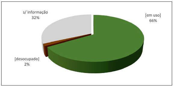 Em Vila Boa, de uma amostragem de 725 imóveis cadastrados em 1818, 482 casas estavam ocupadas, 12 não estavam sendo utilizadas e 231 não apresentavam informações quanto à sua ocupação (Figura 7). Desses 231 imóveis, 138 foram tributados em 1818, o que nos leva a crer que estavam sendo utilizados. Considerando este quadro e contabilizando todos os imóveis tributados, podemos afirmar que a taxa de ocupação dos imóveis de Vila Boa era de 85,5%, para um total de 620 casas tributáveis e, portanto, sendo utilizadas. Da parcela dos 12 imóveis desocupados, 10 estavam arruinados,70 1 imóvel sem morador e 1 imóvel em construção - todos cadastrados na repartição do Rozario. Infelizmente, no caderno do distrito de Santana, não foram disponibilizadas informações tão refinadas, o que compromete a análise não só dessa repartição, mas de Vila Boa como um todo.