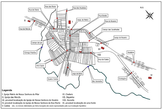A toponímia indicou a existência de certos equipamentos no arraial ou nos arredores, conforme aparece nos nomes de determinados logradouros, como Rua da Olaria, Rua da Cadea ou Contagem; da mesma forma nos acena o lugar das igrejas do arraial: o Largo da Matriz e Rua da Merces, e nos apresenta pistas da localização da extinta Igreja do Rosário dos Pretos, uma vez que dois logradouros fazem menção ao templo: Largo do Rozario e Rua do Rozario. Por outro lado, aspectos socioculturais e vocações locais transparecem pela toponímia, por meio de vias identificadas por Campo das Cavalhadas, Jogo da Bola, Vira Copos, Paneleira e Campo da Lan. Pessoas vindas de outras partes da colônia também foram homenageadas, caso da Rua dos Paulistas. Essas dicas nos guiaram na empreitada de localizar as vias na planta atual de Pilar, uma vez que vários logradouros tiveram seus nomes alterados ao longo dos anos.