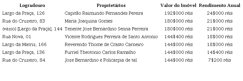 Diante dessas evidências, podemos arriscar que alguns dos proprietários que possuíam mais de um imóvel localizado no Largo do Rozario e na Rua do Rozario, provavelmente os usariam para atividade comercial, optando por residir em outro endereço ou mesmo nos fundos da loja - caracterizando imóveis de uso misto. Outra questão importante diz respeito à finalidade dos imóveis: desse apanhado de 17 bens identificados nos dois logradouros, todos estavam na posse dos seus proprietários, ou seja, nenhum estava alugado. Ao analisarmos onde estavam os outros imóveis desses proprietários, verificamos que o raio de abrangência era pequeno, limitando-se às ruas de tras do Rozario, do Ouvidor e Direita - e ao próprio Largo do Rozario e a Rua do Rozario. Outro ponto de destaque é o valor elevado do rendimento anual dos imóveis - o que corresponde a edificações muito valorizadas, tendo em vista a testada estreita dos terrenos onde as casas estavam implantadas.