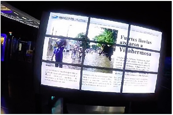 No mesmo módulo, já com outro grupo (G2), observa-se que a leitura para explorar e entender o funcionamento do módulo expositivo também pode ser bem-sucedida, pois, além de fornecer instruções, contribui para que os visitantes se apropriem de forma mais engajada tanto dos objetos museais como das informações que eles contêm. O diálogo entre os adolescentes no módulo “Inundações” (Ex. 4, Figura 2) mostra evidências disso.