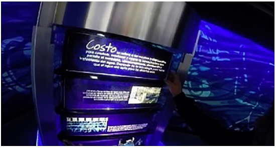 No exemplo, ao buscar mais informações sobre o módulo no painel informativo, os visitantes encontram uma pergunta motivadora que propõe uma reflexão sobre o conteúdo científico envolvido. Diferentemente dos exemplos 1 a 4, no painel Água: Valor, Custo e Preço não há explicações sobre o uso ou a manipulação do objeto, mas conteúdos adicionais que complementam a experiência museológica, fomentando a posição crítica dos visitantes frente a uma questão da vida cotidiana que dialoga com questões políticas e econômicas sobre o uso dos recursos hídricos, afinal, “se a água é gratuita, deveríamos pagar o serviço pelo qual ela chega a cada domicílio?”.