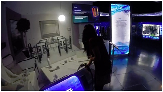 Diante disso, observamos que os grupos de adolescentes utilizam essas placas para compreender como devem interagir e explorar o objeto museal. Para ilustrar, apresentamos um trecho do Grupo 4 (G4) do módulo “Água virtual” (Figura 1) - que consiste em um diorama de uma casa no qual se compara a quantidade de água utilizada para produzir alguns dos objetos usados diariamente. Todos os objetos dispostos têm um código de barras que deve ser escaneado para mostrar em uma tela a quantidade necessária para produzi-los. Nessa interação, uma das adolescentes (visitante 1) lê a placa informativa que explica como o equipamento deve ser operado. Após descobrirem como interagir com o objeto, os adolescentes leem as informações.