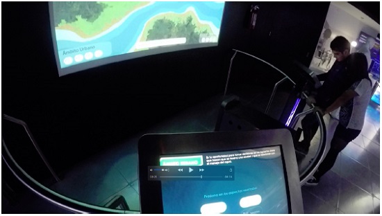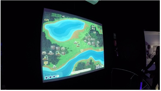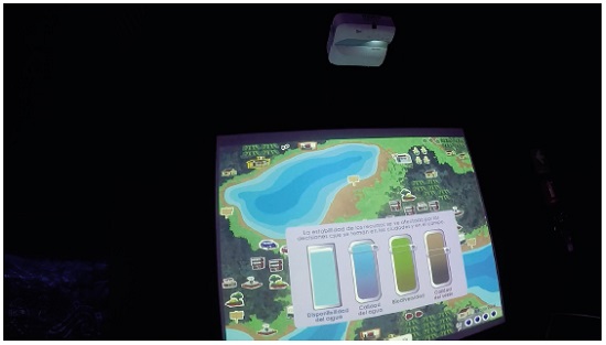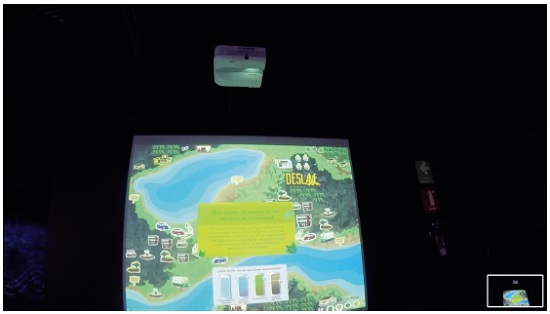 Uma cena emblemática desse tipo de interação e leitura ocorreu no G5, com um jogo sobre o manejo dos recursos hídricos e práticas sustentáveis. Como é ilustrado no exemplo 12 (Figura 7), ao longo de aproximadamente três minutos os adolescentes interagem com o módulo expositivo “Âmbito rural e urbano”, jogo multimídia do qual participam dois jogadores, um no meio urbano e outro no meio rural. Cada jogador tem que tomar decisões para resolver problemas relacionados à habitação, transporte, abastecimento de água e evacuação, bem como gestão de resíduos. O módulo é composto por dois computadores com várias telas que solicitam que os visitantes tomem decisões sobre uso da água e instalações urbanas ou rurais (Figuras 7 e 8). As consequências das escolhas são projetadas em uma tela maior, disposta em frente aos computadores da interação (Figuras 9 e 10).