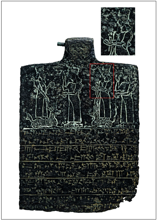 Nas representações iconográficas também se observa o lugar da escrita por meio de suas ferramentas. Dentre as fontes iconográficas disponíveis que apresentam o instrumento de escrita cuneiforme (o stylus), há representações simbólicas do deus Nabû, divindade assírio-babilônica associada à prática dos escribas.66 As ocorrências, em estelas, pedras de fronteira e selos cilíndricos, em geral, aparecem na representação de um objeto, em muitos casos semelhante à forma de uma cunha, mormente na posição vertical (Figura 1).