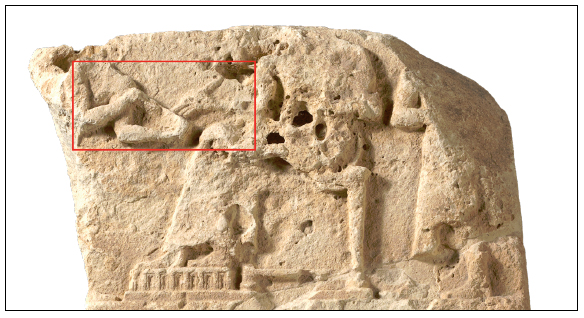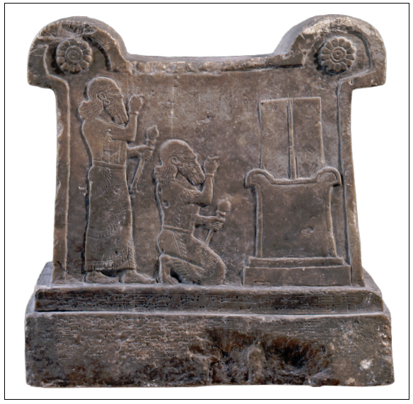 Além dessas fontes, encontra-se o stylus relacionado à própria função da escritura. Sem contar com imagens mais recentes (do primeiro milênio AEC) de sujeitos segurando um suporte para escrita numa das mãos e na outra o stylus, há dois casos mais recuados com a imagem do instrumento de escrita em situações e formas desproporcionais. No primeiro caso, numa estela do período de Ur III (séc. XXII-XXI AEC), há uma cena fragmentada (Figura 2) de um sujeito segurando com ambas as mãos um grande suporte, enquanto outra pessoa, sentada (posição que pode indicar sua qualidade divina ou de grande status), utiliza um instrumento alongado e visível e que está em contato com aquela superfície (possivelmente para imprimir algo nela). Já no segundo caso (Figura 3), o conhecido pedestal de Nusku, do período de reinado do assírio Tukulti-Ninurta I (ca. 1233-1197 AEC), a figura do rei é esculpida em dois momentos (em pé e em genuflexão, em ambos assumindo uma posição de adoração) diante de um patamar (provavelmente um altar), no qual estão apoiados um objeto quadrangular (provavelmente um tablete) e um instrumento longilíneo e fino, sobre o qual se debate se é um stylus ou um cetro. Guardadas as especulações interpretativas, esses casos recuperados por Cammarosano de ocorrências do instrumento de escrita em fontes mesopotâmicas de cultura material também chamam a atenção para possíveis significados do stylus (bem como do tablete), associados à aproximação ao universo além do terreno.