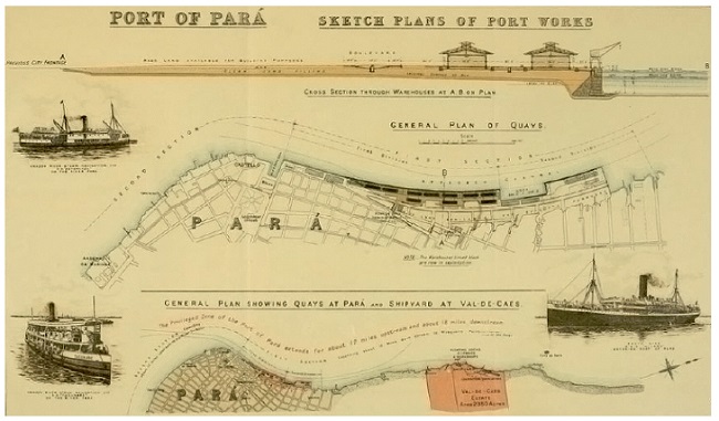 A nova imagem passaria a ser apresentada por meio da construção e do movimento do novo porto a ser elaborado a partir de 1906 por Percival Farquhar, quando o poder legislativo autorizou a concessão desses melhoramentos no Decreto nº 5.978 de 18 de abril de 1906,17 configurando uma nova forma à orla da cidade. Por meio do Decreto nº 6.283 de 20 de dezembro de 1906,18 o Exmo. Sr. Presidente da República Dr. Francisco de Paula Rodrigues Alves e o Ministro de Estado de Negócios de Indústrias, Viação e Obras Públicas, Dr. Lauro Severiano Muller, autorizam a funcionar no estado a Port of Pará,19 empresa constituída pelo engenheiro Percival Farquhar por meio de ações vendidas nas bolsas de valores da França, Bélgica, Canadá e Estados Unidos da América do Norte. Exercendo o direito da concessão à Port of Pará, como primeiro passo, encampou todos os trapiches do litoral da cidade, providenciando suas demolições, e construiu em seus lugares o moderno cais de Belém, cujas instalações são até hoje tidas como as melhores do Brasil.20