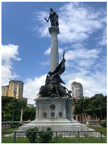 Na gravura, em frente ao Theatro, é representado o Monumento à República (Figura 10), situado na Praça da República. Escolheu-se representar apenas o monumento e não o todo do traçado da praça. Inaugurado em 15 de novembro de 1897, com altura de 22m, foi resultante de um concurso - divulgado no Brasil e na Europa por meio de jornais de grande circulação - que contou com ampla presença de participantes italianos: o vencedor foi o escultor genovês Michele Sansebastiano.37 Sobre uma coluna dórica encontra-se Marianne, símbolo francês de representação da República. Segundo Soares, “o projeto original previa que ela empunhasse um ramo de oliveira, mas o símbolo foi considerado pacifista, do ponto de vista militar, e substituído pela espada”.38 Há outras figuras representadas na base da coluna e no pedestal do monumento, como gênios, um leão e uma mulher que representa a História, bem como nomes de defensores dos ideais republicanos no Brasil, como Tiradentes, Floriano Peixoto, José Bonifácio e Benjamin Constant (Figura 11).