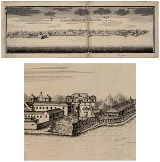 Em carta do bispo D. Frei Miguel de Bulhões à Corte, de fevereiro de 1759, envia-se a Portugal desenhos para a Sé de Belém, de autoria de Landi,42 o que denota o marco inicial da intervenção de Landi na Catedral. Importante ressaltar a presença marcante dos pináculos - também conhecidos como obeliscos piramidais - na área do coroamento acima da grande cimalha da fachada principal da Catedral. Esses elementos são uma das imagens que repetidamente se movimentam nas obras de Landi, com destaque para as gravuras dedicadas a Sant’Ana e para o arco triunfal dedicado a D. João III. A presença da Igreja da Sé na gravura da apólice da Port of Pará enfatiza a áurea memorialista de Belém no século XVIII e atesta a longevidade histórica da cidade que, no momento da confecção da gravura analisada, já completava quase 300 anos.