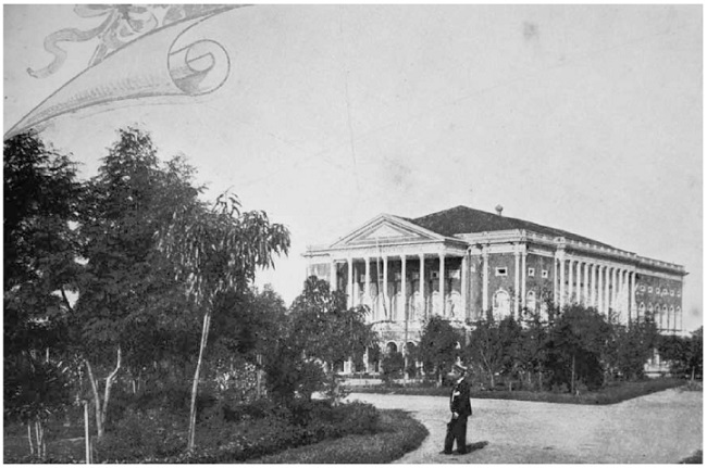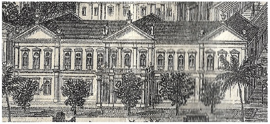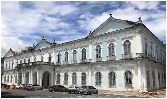 O Palácio Antônio Lemos (Figura 16), inicialmente chamado de Paço Municipal, foi idealizado pelo Presidente Antônio Coelho de Sá e Albuquerque e construído no século XIX para ser sede do poder da província e de sua capital. Abrigaria instituições como a Assembleia Provincial, a Câmara Municipal, o Tesouro Público Provincial e as Obras Públicas. O projeto de José Coelho da Gama e Abreu43 data de 1860 e caracteriza-se pelo ecletismo com predominância do neoclassicismo tardio. Em 1862, foram concluídos os alicerces, faltando apenas os cubos ou castelos de engenharia em que deveriam ser assentadas as colunas.44 A obra continuou no governo de Abel Graça, época em que o Paço sofreu modificações nos planos originais, com a demolição dos entrecolúnios dos pátios interiores para maior solidez do edifício.45 Apenas no final do governo de José Coelho da Gama e Abreu, em 1881, foram realizadas as obras de acabamento primoroso do Palácio, como as de pedreiro, carpinteiro, pintor e estucador. Estavam concluídos, então, a escada monumental e os acabamentos do terraço e pórtico.46