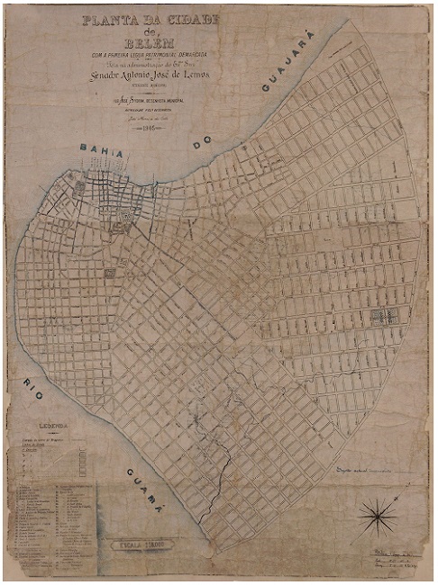 Quanto aos elementos arquitetônicos e urbanísticos representados na gravura, destacamos sua posição real na malha urbana de Belém. A partir do mapa da primeira légua patrimonial de Belém, feito por José Sidrim em 1905 (Figura 4), na gestão de Antônio Lemos, podemos observar a disposição e a orientação das obras arquitetônicas próximas ao centro irradiador da cidade. É importante atentar-se, também, para o distanciamento entre o aspecto real da orla de Belém e o da gravura. Ainda que a data da gravura (1920) e a do mapa (1905) distem 15 anos, o mapa é o documento cartográfico oficial mais próximo cronologicamente e nele já atesta-se todas as obras que destacamos na análise (Figura 5). A cartografia de Belém só é beneficiada com outro mapa oficial em 1955, desenvolvido pela Superintendência do Plano de Valorização Econômica da Amazônia (SPVEA), órgão instituído por Getúlio Vargas em 1953, posteriormente substituído pela Superintendência do Desenvolvimento da Amazônia (Sudam). O vazio cartográfico desse período de 50 anos pode ser explicado pelo declínio da economia gomífera em Belém: o fluxo de capital e as grandes obras de infraestrutura urbana estagnaram após o boom da Belle Époque, o que resultou na recessão da produção cartográfica.