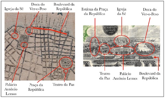 A apólice da Port of Pará (Figura 2) analisada neste trabalho, datada de 1920 e de número serial A41536, faz parte do acervo pessoal de Flávio Nassar.31 Em seu cabeçalho, circunscrita pela rebuscada moldura verde e pelo nome da empresa em tipografia destacada, apresenta-se a gravura a ser analisada (Figura 3). Constitui-se em uma visualização aérea, em perspectiva de ponto de fuga único, que representa a área portuária da cidade, com a reconfiguração e o reposicionamento de protagonistas arquitetônicos do tecido urbano da cidade, assim como o próprio redesenho da orla da cidade e a reformulação de obras urbanísticas. Desses protagonistas, destacamos: o Theatro da Paz, o Monumento à República, a Igreja da Sé, o Palácio Antônio Lemos, a Doca do Ver-o-Peso e o Boulevard da República (Figura 5). São amostras de três séculos da história de Belém, que compõem uma imagem trans-histórica e refletem diferentes contextos sociopolíticos, econômicos e artísticos dos séculos XVIII, XIX e XX. Neste trabalho, analisaremos individualmente esses protagonistas e suas representações na gravura da apólice escolhida.