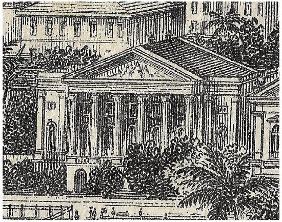 Na gravura da apólice, há uma fusão dos dois momentos na representação do Theatro: embora sejam seis as colunas sob o frontão da fachada principal, o que representa a edificação após a reforma inaugurada em 1905, apresenta o frontão ainda não recuado, configurando-se como um alpendre cuja área de cobertura corresponde à da inauguração inicial de 1878, faceando o limite frontal da edificação. Na reforma inaugurada em 1905, esse alpendre foi retirado, já que o frontão foi recuado, e foram implementados uma colunata de seis colunas e um terraço descoberto com guarda-corpo em balaustrada. A representação do Theatro da Paz na gravura (Figura 6) constitui-se, então, como uma representação híbrida trans-histórica que mescla aspectos da edificação de duas épocas diferentes (Figuras 7, 8 e 9).