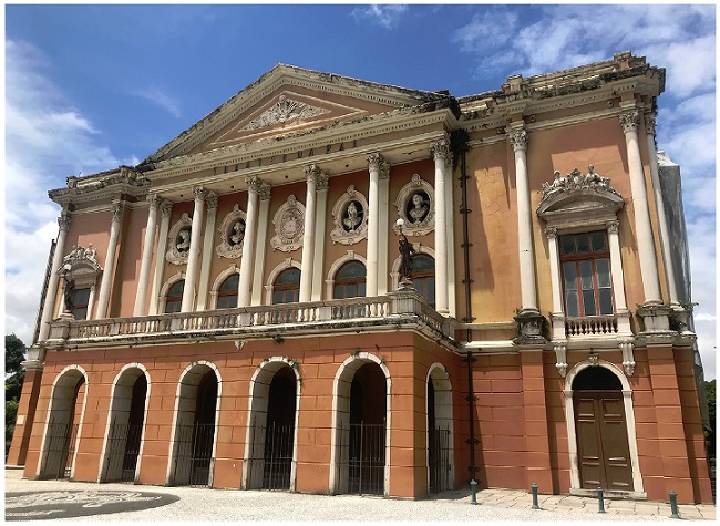 O Theatro da Paz, um dos principais símbolos arquitetônicos relacionados diretamente à Era da Borracha em Belém, foi inaugurado em 15 de fevereiro de 1878 com a apresentação do drama As duas órfãs de Adolphe Phillipe d’Ennery. Com características do ecletismo de forte influência neoclássica, o Theatro foi construído entre 1869 e 1874 e passou por ampla remodelação entre 1904 e 1905,35 responsável pelo aspecto atual da edificação. Essa intervenção, ocorrida no governo municipal de Augusto Montenegro e no de Antônio Lemos, entre outras mudanças significativas no Theatro, foi responsável pelo recuo do frontão e pela emblemática troca do número de colunas na fachada principal: de sete, no projeto original, para seis, após reforma, mais alinhado aos cânones clássicos. Não somente a fachada foi alterada na intervenção, como também houve a remodelação do palco e da sala de espetáculos, conforme o modelo italiano; a introdução de vários elementos ornamentais, tanto no interior quanto no exterior; e a atualização do sistema de iluminação elétrica.36