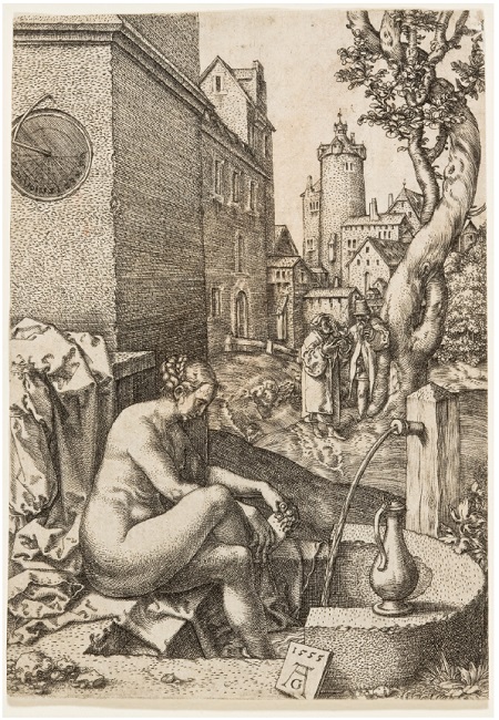 O Museu de Arte de São Paulo possui uma gravura que representa Suzana no banho surpreendida pelos velhos, de meados do século XVI (Figura 1). Na imagem, Susana banha seus pés em uma simples fonte, enquanto os velhos discutem a pertinência de abordá-la nessa ocasião. Destaca-se ainda a cidade imaginária que serve de pano de fundo para o enredo. É impossível não aludir ao grande relógio de sol em plano intermediário aos personagens, possivelmente indício de temperança que prenuncia um complexo de forças de ação e reação. De um lado, a ausência de destemperança dos juízes, incapazes de submeter suas paixões positivas; do outro, Susana, que devia se imbuir de temperança para agir de occasio. Na verdade, tal representação é apenas uma de muitas que, com distintos atributos, versam sobre essa temática.