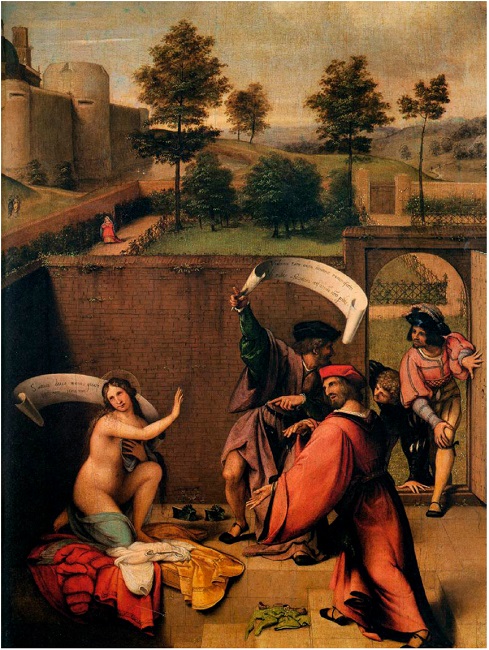 O óleo sobre madeira, de Lorenzo Lotto, firmado e datado Lotus pictor 1517 (Figura 2), apresenta um panorama peculiar do tema. Subordinado a uma visão diacrônica dos acontecimentos a partir da lógica medieval de representação de tempos múltiplos em uma mesma obra, Lotto nos permite acompanhar a integralidade da trajetória de Susana, desde o momento em que caminha ao jardim até a chegada de pessoas que entreouvem seus gritos. Outra referência à tradição pictórica medieval está no jardim fechado em que Susana se banha. Tais jardins denotavam pureza e virtuosidade daqueles que em seu interior se encontrassem, sendo largamente utilizados em representações da Virgem e outras santas. Para corroborar esse ponto, Lotto atribui um halo a Susana, ainda que ela nunca tenha sido santificada, e reforça a violência dos velhos que adentram um espaço que deveria ser inviolável. De outro modo, para além dos típicos trajes italianos da primeira metade do século XVI, endossados pelos personagens, a obra também apresenta outros fortes traços do renascimento na península. A perspectiva, que protagonizava a arte do período, conecta e articula o espaço privado do jardim murado com a paisagem natural do espaço público. Ao fundo, uma grande fortaleza se impõe no horizonte, como um atributo que parece explicitar a própria virtude da força que Susana demonstrará no momento mais crítico do episódio. Apesar de o comanditário da obra não ser conhecido, tem-se notícia de que ela fora produzida durante o período em que o pintor esteve ativo a serviço da república de Veneza. Desse modo, fazendo eco a Gloria Fossi, podemos pensar até que ponto a obra não alude ao bom governo da justiça na Sereníssima, já que na Bíblia ela se mostra implacável, desmascarando e condenando os velhos.26