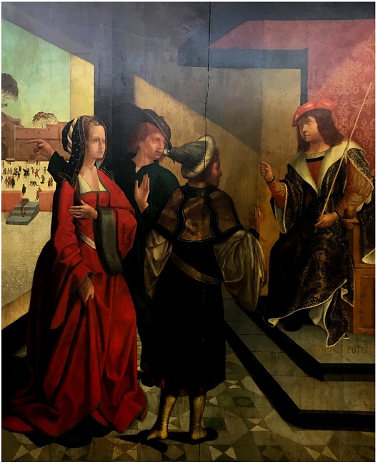 Outra obra pertinente se trata de O profeta Daniel e a casta Susana, pintada por Francisco Henriques (Figura 3), de origem flamenca, ativo em Portugal a serviço de D. Manuel I. Sabe-se que a obra fora encomendada pelo próprio rei, que em ordem régia datada de 5 de janeiro de 1509 instruiu Álvaro Velho, então vedor e recebedor das obras do mosteiro de São Francisco na cidade de Évora, a receber e alojar o pintor enquanto ele estivesse ocupado na execução de retábulos.27 Originalmente, a obra compunha o conjunto de painéis que ocupavam as capelas laterais da igreja de São Francisco de Évora, considerados um dos mais notáveis e belos exemplares da pintura manuelina.