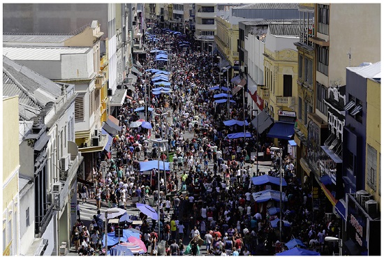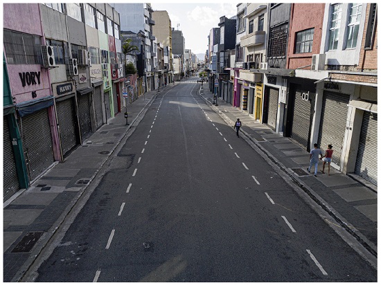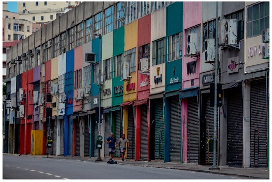 No início da pandemia do novo coronavírus (Sars-CoV-2), nos meses de abril e maio de 2020, quando os índices de isolamento social estavam mais elevados e o comércio foi fechado por decreto municipal, não eram raras imagens das ruas Vinte e Cinco de Março e José Paulino vazias, com as portas de enrolar das lojas abaixadas, em jornais impressos e na televisão (Figuras 1 e 3). Como esses são veículos jornalísticos, pode-se supor que o objetivo era a veicular imagens impactantes que capturassem a atenção do leitor e do espectador. A escolha mais frequente pela Vinte e Cinco de Março e pela José Paulino evidencia que o comum, em uma situação pré-pandêmica, eram imagens dessas ruas com os comércios abertos e as calçadas e leitos carroçáveis com intensos fluxos de mercadorias, transeuntes e veículos (Figuras 2 e 4).