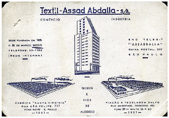 A partir de 1932, Abdalla tornou-se o único proprietário da loja de tecidos e armarinhos, mas o fundo imobiliário permaneceu compartilhado com o primo, que fundou com seus próprios filhos outro comércio no mesmo ramo. Abdalla expandiu a atuação para o ramo industrial a partir de 1936, ano em que adquiriu uma fábrica de fiação e tecelagem em Salto, no interior do estado. Cinco anos depois, fundou a Indústrias Santa Virgínia de Fiação e Tecelagem, e a junção das duas fábricas formava a Têxtil Assad Abdalla S.A. Comércio e Indústria (Figura 13).