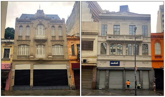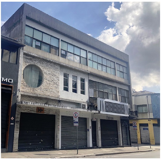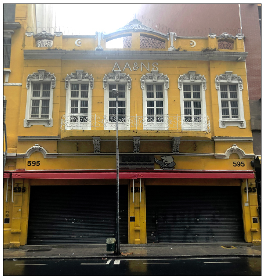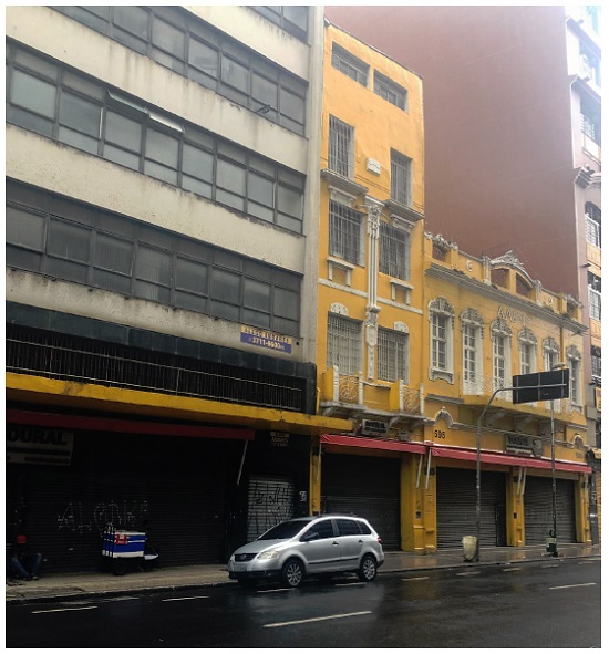 Essa junção de trabalho e moradia em um mesmo imóvel, normalmente loja, oficina, ou armazém em baixo e residência em cima, caracteriza a ocupação de diversas áreas centrais de São Paulo cuja urbanização operou a partir da proliferação de pequenos e médios comércios e serviços, por vezes encabeçados por proprietários imigrantes. No caso da Vinte e Cinco e de outras ruas da região central, entre esses edifícios mistos, aqueles com atmosfera de “palacete”, tais quais o 141/595, marcam a paisagem atualmente. O uso comercial ou de serviços no térreo implica múltiplas aberturas para a rua, e varandas e janelas nos pavimentos superiores sugerem ocupações residenciais. Chamam a atenção pela ornamentação de suas fachadas, que se contrapõem às superfícies lisas dos edifícios funcionalistas que viriam depois. São composições com elementos visuais provenientes de diferentes linguagens arquitetônicas, e que por isso frequentemente acabam sendo enquadradas como “ecléticas” (Figura 9).