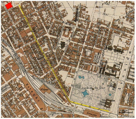 No Bom Retiro, tanto o crescimento da indústria de confecções nos anos seguintes quanto a participação da comunidade judaica nesse crescimento podem ser verificados por meio dos números revelados na pesquisa realizada por Feldman:23 entre 1928 e 1945, foram abertas 310 oficinas de roupas prontas no Bom Retiro, das quais menos de uma dezena eram de propriedade de não judeus. Praticamente metade dessas 310 confecções (47%) localizava-se no principal corredor comercial do bairro: a rua José Paulino, antigo caminho de conexão entre as proximidades da Estação da Luz e a várzea do rio Tietê que, até 1916, era conhecida como “rua dos Imigrantes” devido ao grande fluxo de estrangeiros que por ela passavam para chegar à primeira Hospedaria de Imigrantes da cidade, localizada até 1888 na rua Tenente Pena (Figura 16).24