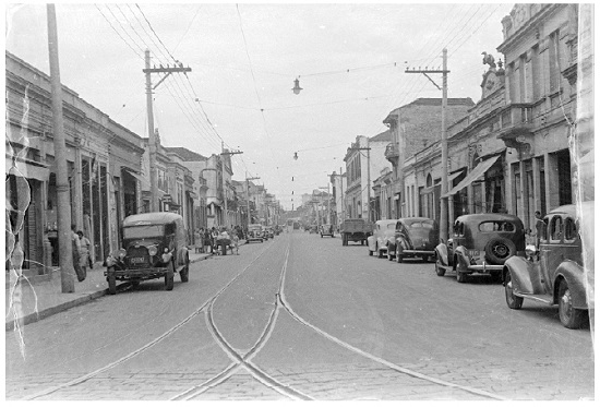 As transformações nas estruturas dos negócios e nos hábitos de consumo dos habitantes da cidade também foram acompanhadas por mudanças na paisagem da José Paulino, porém a correspondência não foi imediata. A imagem da rua capturada pelo fotógrafo Benedito Junqueira Duarte mostra uma verticalização incipiente em 1942, com um conjunto arquitetônico limitado a construções térreas ou de no máximo dois andares (Figura 17). Originalmente construídos pelas comunidades imigrantes precedentes -italiana e portuguesa- para abrigarem residências e armazéns, os imóveis retratados foram ocupados pelas oficinas e confecções de roupas prontas e adaptados ao uso produtivo específico da manufatura de itens do vestuário. A repetição de toldos e múltiplas portas em um único imóvel indica a adaptação das casas também para o uso comercial, sendo ainda frequente a ocupação dos fundos ou do pavimento superior como residência da família proprietária do negócio.26