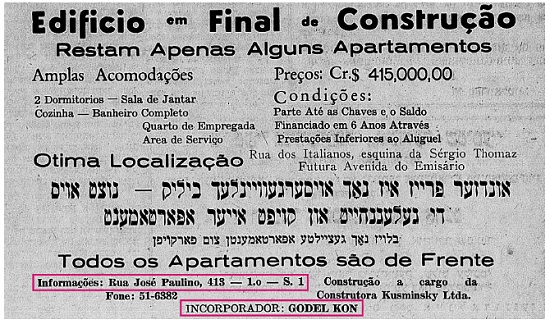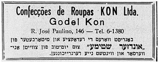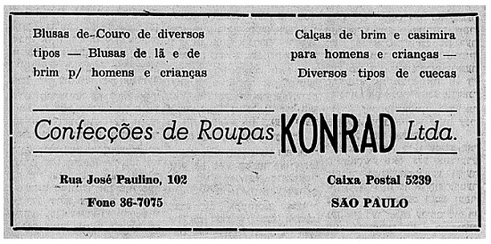 Entre os conhecidos e potenciais clientes da vizinhança incluíam-se parentes. Em 1956, foi concluída a reforma do prédio de numeração 206/210, propriedade de Jacob Nachmanovitch e Rafael Kon, irmão mais velho de Godel Kon. Jacob era o marido de Pola, filha de Rafael e prima de Samuel e João. Genro e sogro eram sócios na Confecções Konrad Ltda., que, a despeito de usar o termo “confecções” no nome, atuava como revendedora nas áreas de moda masculina e infantil. Anúncio de 1955 (Figura 20) apresenta os produtos comercializados pela dupla (blusas de couro, blusas de lã, blusas de brim, calças de brim, casimiras e cuecas), uma variedade que extrapolava os padrões das confecções da José Paulino de então, que de forma geral davam conta de produzir uma gama reduzida de artigos. O anúncio também informa que, anteriormente à conclusão da reforma do edifício 206/210, a Konrad ocupava o imóvel de número 102 na mesma rua. Esse trânsito das confecções por diferentes imóveis na José Paulino era comum e possivelmente provocado por dinâmicas imobiliárias como compras, vendas, reformas e até despejos. O próprio Godel Kon alugou, nos últimos anos de funcionamento de sua confecção, um salão no pavimento superior do edifício localizado no número 106, o que indica que provavelmente no final dos anos 1940 o edifício 393/397 já não era mais utilizado nem como moradia nem como trabalho pela família (Figura 21).