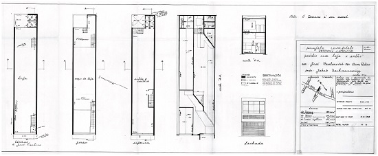 A inexistência de atividade produtiva na Confecções Konrad influiu no projeto de reforma de sua nova sede, uma construção de somente dois pisos: loja no térreo e escritório no pavimento superior. O edifício reúne as características mais presentes na tipologia que marca o processo de verticalização da José Paulino: linguagem utilitária; estrutura em concreto armado; planta estreita (6,1 metros de frente e 31 metros de profundidade - proporção 1:5); ausência de recuos; abertura frontal alargada ao máximo; e caixilho metálico.30 O que o difere do padrão mais encontrado é a ausência de mais pavimentos destinados às atividades de produção, como corte, costura, acabamento, passadoria (Figura 22).