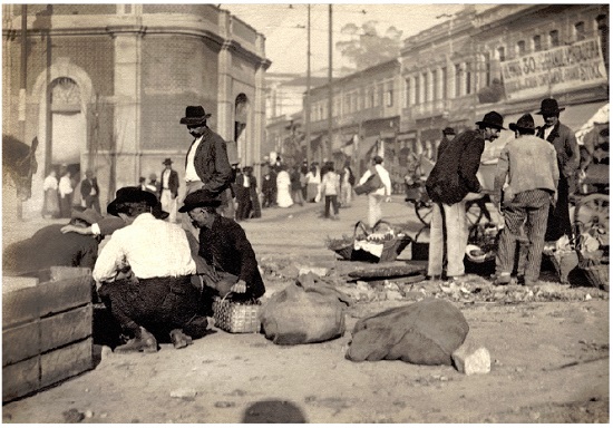 Nessa época, os mascates se concentravam na região da Vinte e Cinco de Março devido à presença do principal mercado de São Paulo, onde se encontrava uma variedade de mercadorias a serem comercializadas pelas ruas e avenidas da cidade (Figura 6). O Mercado Municipal havia sido aberto no cruzamento da Vinte e Cinco com a General Carneiro7 em 1867, mesmo ano da inauguração do trecho urbano da ferrovia São Paulo Railway, que conectava o interior ao litoral. Posteriormente, esse mercado principal ganhou dois anexos nas proximidades: o Mercado Caipira, concentrando a venda de produtos hortifrutigranjeiros, e o Mercado do Peixe. O complexo foi desativado no início da década de 1930 e transferido para um imponente edifício na rua Cantareira, projetado pelo célebre arquiteto Ramos de Azevedo e construído entre 1928 e 1933, onde permanece até os dias atuais (Figura 7).8