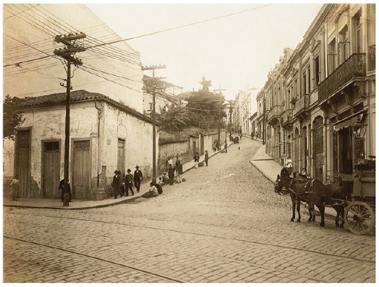 A outra vantagem relacionava-se ao fato de a região ter sido uma importante porta de entrada de mercadorias da cidade até a conclusão dos processos de retificação do rio Tamanduateí, em 1896. Por ser navegável quando ainda mantido em seu fluxo original, o rio era utilizado para transporte de abastecimentos importados e nacionais, que desembarcavam em algum dos quatro portos da região. O mais importante deles era conhecido como Porto Geral, e sua memória social fixou-se no território a partir da nomeação da famosa ladeira, em 1916 (Figura 8).10