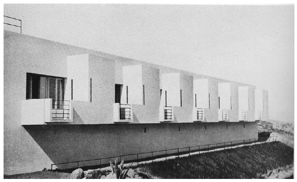 Embora não se tratasse de construir um bairro real de vivendas modernas, como foi o caso no antecedente europeu promovido pela Werkbund, as maquetes preparadas para a exposição de 1932 correspondiam, majoritariamente, a programas residenciais: a Vila Savoye de Le Corbusier (que retornaria em 1949 em From Le Corbusier to Niemeyer); a Tugendhat de Mies; a casa em Mesa, Denver, de Frank Lloyd Wright; a casa de Oud na Carolina do Norte; uma torre de apartamentos num subúrbio nova-iorquino, de Raymond Hood; o projeto para Chrystie-Forsyth, uma urbanização residencial de Howe & Lescaze; os Apartamentos Lux, em Illinois, dos irmãos Brothers. As exceções eram a Bauhaus de Gropius em Dessau e o projeto escolar de Neutra para Rush City Reformed, sua cidade ideal de 1926-1927.57 Mesmo que por meio de uma coleção de maquetes, e não de seus referentes construídos, a exposição pretendia sugerir ao público americano uma demonstração equivalente à europeia de uma relação possível entre a “nova arquitetura”, como estilo, e a modernização e o melhoramento das condições materiais de vida da população, em seus modos de habitar. Um comunicado do museu à imprensa descreve assim essas “casas do futuro”: