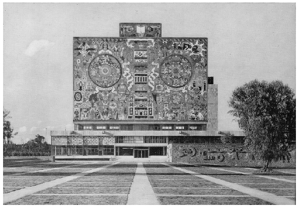 A Cidade Universitária do México, que aparece várias vezes no catálogo de 1955, já não era um conjunto de edifícios onde fosse obedecida a restrição à decoração aplicada, como rezava o cânon de 1932. A lâmina 6 do catálogo Latin American Architecture since 1945 corresponde ao edifício da Biblioteca Central (1951-1953), de Juan O’Gorman, Gustavo Saavedra e Juan Martínez de Velasco. “Embora não seja o maior, nem o mais alto dos edifícios da Cidade Universitária do México, a Biblioteca é certamente o mais original”, escreve Hitchcock, pois O’Gorman usou as paredes cegas da torre onde se armazenam os livros, marcadas apenas por pequenas janelas nas escadas, “como um códice ilustrado”. Na fotografia (Figura 12), o corpo alto do edifício aparece recoberto pelo gigantesco mosaico figurativo de autoria do próprio O’Gorman, arquiteto e pintor, faceando um dos principais espaços abertos do campus, e avaliado por Hitchcock como “o exemplo de maior sucesso do uso em larga escala da decoração figural na arquitetura moderna, da qual os mexicanos são especialmente adictos”.88 Nesse ponto, cabe destacar que Hitchcock está tomando uma posição contrária a boa parte da crítica arquitetônica da época, que havia seguido Max Bill em sua diatribe contra o mural na arquitetura moderna, dirigida a brasileiros e mexicanos.89