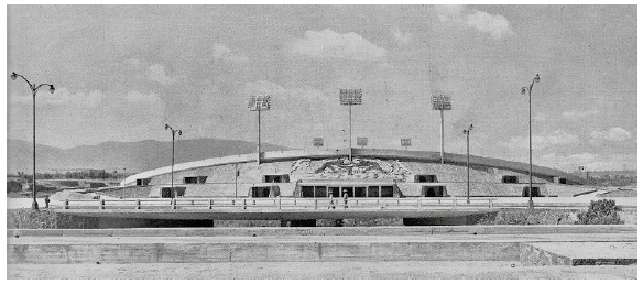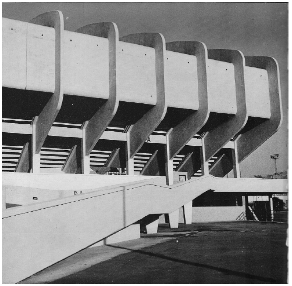 A lâmina 11 do catálogo Latin American Architecture since 1945 corresponde ao Estádio Olímpico (Cidade Universitária do México, 1951-1952), de Augusto Pérez Palacios, Raúl Salinas e Jorge Bravo (Figura 13). Uma planimetria e uma seção esquemática mostram que o estádio é uma construção de forma ovalada, inscrita num anel circular, semienterrada com relação à cota de ingresso. As arquibancadas crescem e se elevam na direção leste-oeste, para se retraírem na direção norte-sul e conformar, assim, o perfil elíptico do estádio. Na página oposta, a fotografia tomada por McKenna está centralizada sobre o acesso principal, abarcando integralmente a face oeste. O ponto de vista escolhido por McKenna revela uma fachada regrada pela simetria axial, sublinhada pelo relevo policromático de Diego Rivera sobre o pórtico de acesso, que o próprio Hitchcock descreve como “decoração figurativa”.90 Não se trata apenas de tolerar a simetria e a inclusão do elemento decorativo, mas de tornar evidente a primeira e funcional, o segundo. A despeito de que o edifício pudesse ser inteiramente circulado, o enquadramento fotográfico escolheu retratá-lo precisamente de onde ele se vê simétrico.