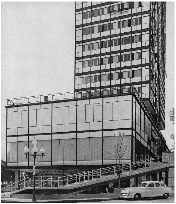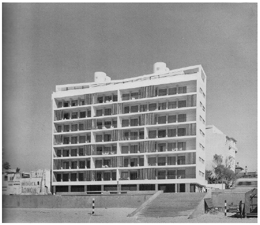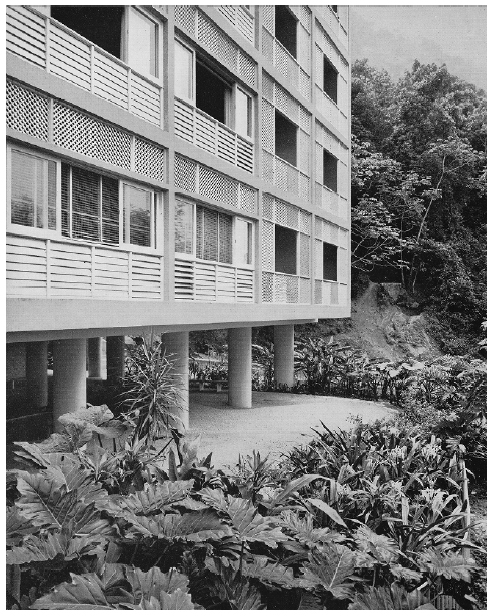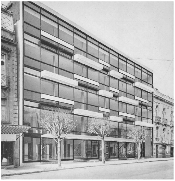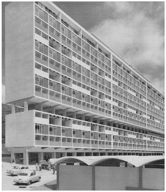 Os exemplos que seguem são edifícios de escritórios urbanos: o Banco Boavista de Niemeyer no Rio de Janeiro; o edifício Valenzuela de Ricardo de Robina e Jaime Ortiz Monastério no México D. F. (Figura 19); e o edifício Polar de Martin Vegas e José Miguel Galia em Caracas (lâminas 19-21) (Figura 20). Os dois exemplos seguintes, o hospital de Rino Levi e Roberto Cerqueira César em São Paulo (lâmina 22) e o hotel de Toro, Ferrer e Torregrossa em Porto Rico (lâmina 23), são a transição para os programas essencialmente residenciais. Primeiro, se apresentam as formas de organização coletiva da habitação: os grandes conjuntos de habitação de Mario Pani (México D. F.), Affonso Eduardo Reidy (Rio de Janeiro), Guido Bermúdez (Caracas) (Figura 21) ou Santiago Agurto (Lima); os alojamentos para a aeronáutica de Oscar Niemeyer em São José dos Campos; o conjunto de casas em fita de Cuellar, Serrano e Gómez em Bogotá; o Parque Guinle de Lucio Costa no Rio; os edifícios de apartamentos isolados como os blocos de Raúl Sichero em Montevideo (Figura 22), Jorge Moreira no Rio, Guinand e Benacerraf em Caracas (lâminas 24-35). Logo segue a sequência de casas isoladas, que inclui obras de Le Corbusier e Amancio Williams na Argentina; Antonio Bonet no Uruguai; Oscar Niemeyer, Henrique Mindlin, Oswaldo Bratke e Sergio Bernardes no Brasil; Jorge Costabal e Emilio Duhart no Chile; Juan Sordo Madaleno (Figura 23), Luis Barragán e Francisco Artigas no México (lâminas 36-47).