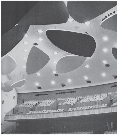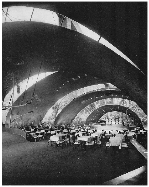 Outro aspecto mencionado é uma sensível homogeneidade no que se refere aos materiais e métodos de construção. Ao contrário do cenário estadunidense, o concreto armado e a alvenaria de tijolos predominavam largamente sobre a construção em ferro e madeira. Empregado em geral segundo a maneira corrente, o concreto armado também encorajou os arquitetos na exploração de novas alternativas técnicas e formais, incluindo as cascas e os paraboloides estruturais. Segundo Hitchcock, como em nenhuma outra parte, o “skyline curvo” era um tema recorrente.97A coleção mostra exemplos da sua aplicação em variados programas e países: Igreja da Pampulha (Niemeyer, 1943) no Brasil e Igreja de la Purísima (Enrique de la Mora, 1947) no México; edifícios para a educação, como a Escola de Administração e Comércio (Guillermo de Roux, René Brenes, Ricardo Bermúdez, 1949-1953) no Panamá, o conjunto escola e ginásio do Pedregulho (Affonso Eduardo Reidy, 1948-1950) e o Instituto de Puericultura (Jorge Machado Moreira, 1953), no Brasil; instalações esportivas, como a Piscina do Departamento de Esportes de São Paulo (Ícaro de Castro Mello, 1952-1953) no Brasil, o Estádio Olímpico (Carlos Raúl Villanueva, 1950-1951) na Venezuela e o Estádio de Basebol (Mesa Gabriel Solano e outros, 1947) na Colômbia; instalações industriais como os Laboratórios CIBA (Alejandro Prieto e Félix Candela, 1953-1954) no México, a Fábrica de Chicletes Clark’s (Francisco Pizano, 1953) na Colômbia; e num programa recreativo, o Cabaret Tropicana (Max Borges, 1952) em Cuba (Figura 15).
