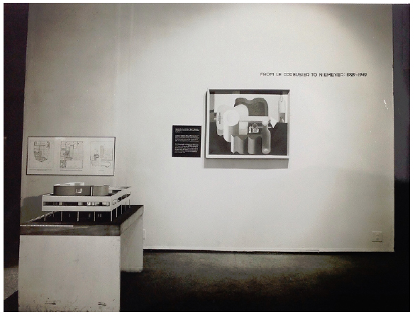 Assim, a exposição “From Le Corbusier to Niemeyer: 1929-1949”, inaugurada no MoMA em fevereiro de 1949, não foi a primeira incursão do museu na produção artística e arquitetônica da América Latina, mas constituiu um elo curatorial precoce entre Hitchcock e a região, que antecede a mostra e o catálogo de 1955 e merece ser examinada (Figura 5).29 Dirigida por Philip Johnson, a exposição tinha Hitchcock como consultor e, como assistentes, Peter Blake e Ada Louise Huxtable.30 De fato, a ideia básica da exposição era de Hitchcock e boa parte dos textos utilizados procediam de Painting Toward Architecture, livro publicado por Hitchcock em 1948, que versava sobre uma coleção de arte privada - The Miller Company Collection of Abstract Art - formada por Emily e Burton Tremaine enquanto ele era o presidente da Miller Company e ela, a diretora de arte.31