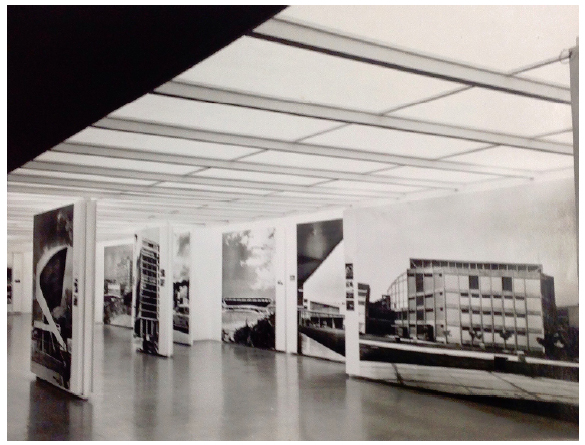 O trabalho do historiador pode recuperar as condições e o cenário de uma exposição passada, como fez Patricio del Real com a exposição “Latin American Architecture since 1945”, oferecendo uma rica descrição da instalação de Drexler em 1955.45 A exposição dispunha de um espaço unitário, cuja geometria original basicamente correspondia a um salão quadrangular, flanqueado por duas alas menores, alinhadas pela face oposta ao ingresso único (coincidente com uma delas).46 Entre outros arranjos possíveis - por exemplo, três recintos constituindo uma sequência vestíbulo, grande salão, pequena sala - , a instalação configurava dois ambientes interligados. Através de recursos arquitetônicos precisos, o esquema aproveitava as variações de geometria e profundidade da sala para demarcar dois recintos de características distintas. O primeiro deles era definido pela continuidade de um forro rebaixado, que penetrava a sala na direção de sua maior profundidade. Composto de placas translúcidas com iluminação embutida, o forro baixo insinuava um primeiro espaço retangular, alongado, do tipo galeria, enfatizado pela disposição, em ambos os lados, de grandes painéis fotográficos estendendo-se do piso à linha do forro. O segundo recinto, acessível através dessa galeria, cobrava unidade por meio da cortiça escura usada para revestir as superfícies expositivas, três paredes onde se encaixavam painéis de tamanhos variáveis, sob a uniformidade de um teto escuro e alto. Entre esses ambientes, numa linha virtual paralela à galeria, estavam dispostos três grupos de unidades individuais para visualização de slides.