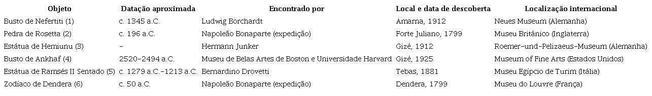 Em 2010 a cidade do Cairo sediou o evento “Cooperação Internacional para a Proteção e Repatriação do Patrimônio Cultural”, envolvendo diversos países mobilizados pela devolução de bens históricos. Essa reunião resultou na redação de um documento que expressou a ideia de pertencimento do patrimônio cultural a seu país de origem, ideia essa que não deveria expirar ou prescrever. Nessa ocasião, os países tiveram a oportunidade de apresentar listas dos principais objetos que gostariam que fossem repatriados (wish list) e o Egito manifestou o interesse pelo retorno do Busto de Nefertiti, da Pedra de Rosetta, da Estátua de Hemiunu, do Busto de Ankhaf, da Estátua de Ramsés II sentado e do Zodíaco de Dendera, conforme apresentados no Quadro 1.