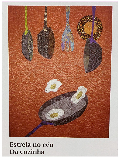 É também em relação ao fogão a lenha e para esta exposição que Wagner Vivan resgata suas memórias da infância. Em sua tela intitulada Estrelas no céu da cozinha (Figura 11), o artista representou frigideiras pretas penduradas e outra em plena atividade, com três ovos estrelados saltando. Essa imagem mostra elementos de um prato sui generis, mas carregado de lembranças afetivas. Segundo ele: A minha vó fazia uma omelete com carne-moída, que até hoje eu não esqueço.72 A tela ganhou um glamour especial com o fundo vermelho reluzente e artisticamente quiltado, uma técnica com costuras que une as três camadas têxteis do patchwork e, ao mesmo tempo, lhe imprime beleza ímpar.
